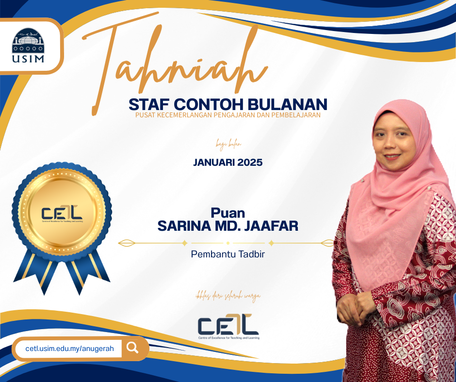 Puan Sarina Md. Jaafar, Pembantu Tadbir telah dianugerahkan Staf Contoh Bulanan bagi bulan Januari 2025. Tahniah diucapkan!. Semoga komitmen ini diteruskan pada masa akan datang.