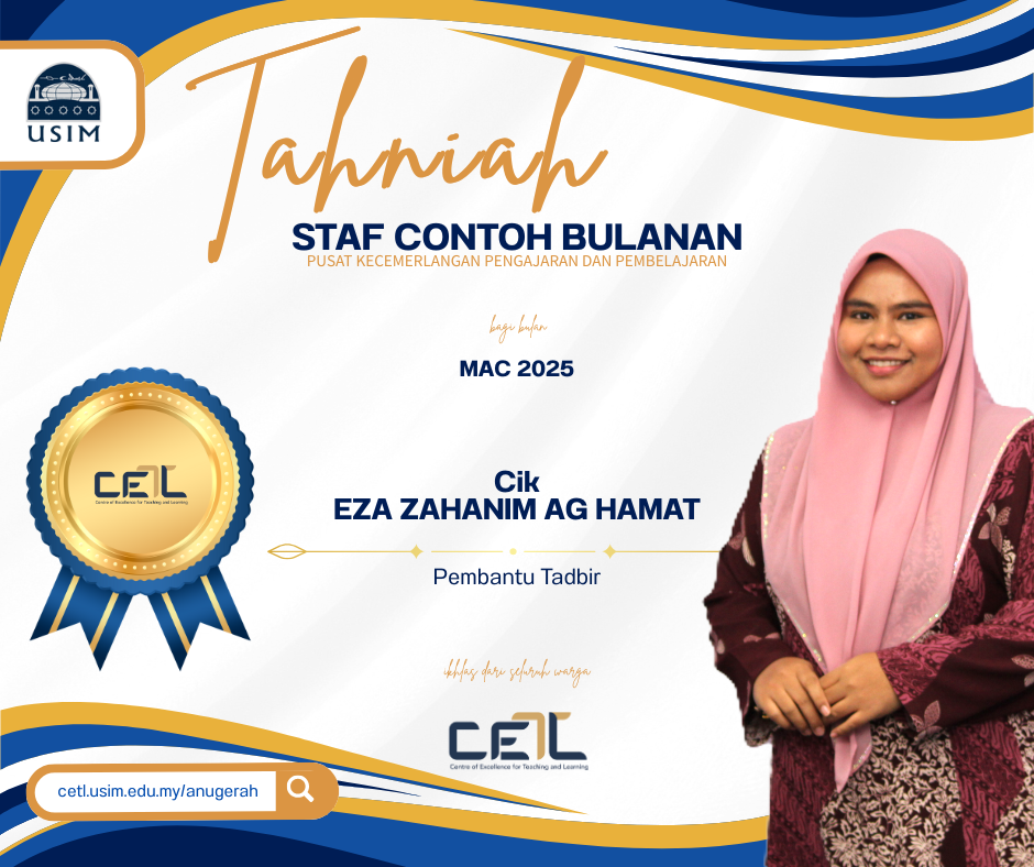 Cik Eza Zahanim Ag. Hamat, Pembantu Tadbir telah dianugerahkan Staf Contoh Bulanan bagi bulan Mac 2025. Tahniah diucapkan!. Semoga komitmen ini diteruskan pada masa akan datang.
