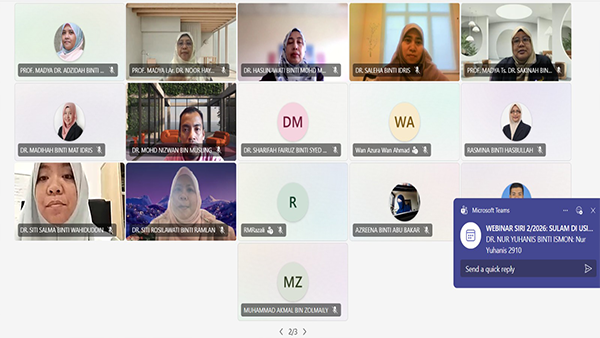 Bahagian Dasar dan Integrasi Ilmu Naqli & Aqli (BDINDA) CETL telah menganjurkan Sesi Webinar Siri 1/2026 : Penerapan dan Pengiraan Peratus Integrasi Ilmu Naqli dan Aqli (INAQ) dalam Program Akademik USIM, Sesi Webinar Siri 2/2026 : SULAM di USIM – Menyantuni Komuniti Melalui Pembelajaran Berasaskan Perkhidmatan secara dalam talian yang telah diadakan pada 28 April 2026 (Selasa).
